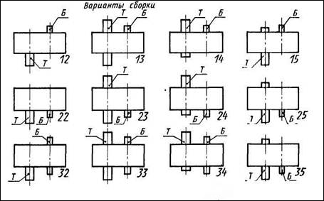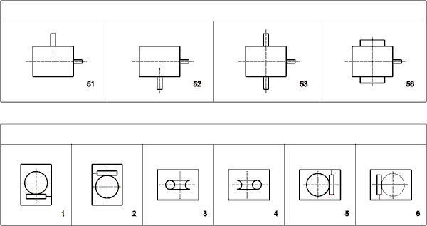 Расположение входного и выходного вала зависит от варианта сборки. Существуют следующие сборки: 11, 12, 13, 16, 21, 22, 23, 26.