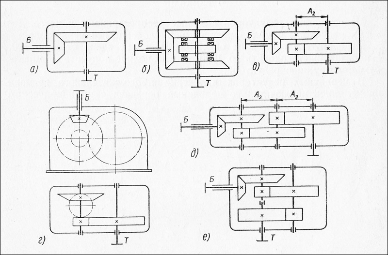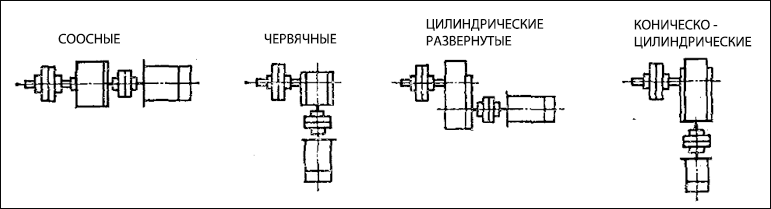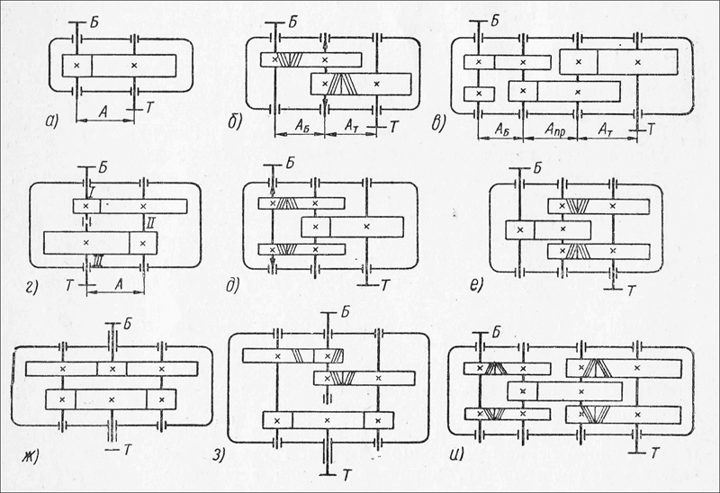 Кинематические схемы наиболее распространенных видов цилиндрических редукторов представлены на рисунке ниже: