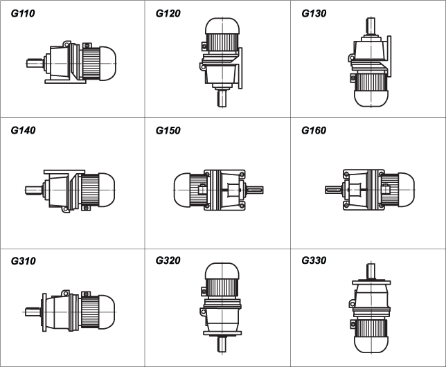 Расположение входного и выходного вала зависит от варианта сборки. Существуют следующие сборки: 11, 12, 13, 16, 21, 22, 23, 26.